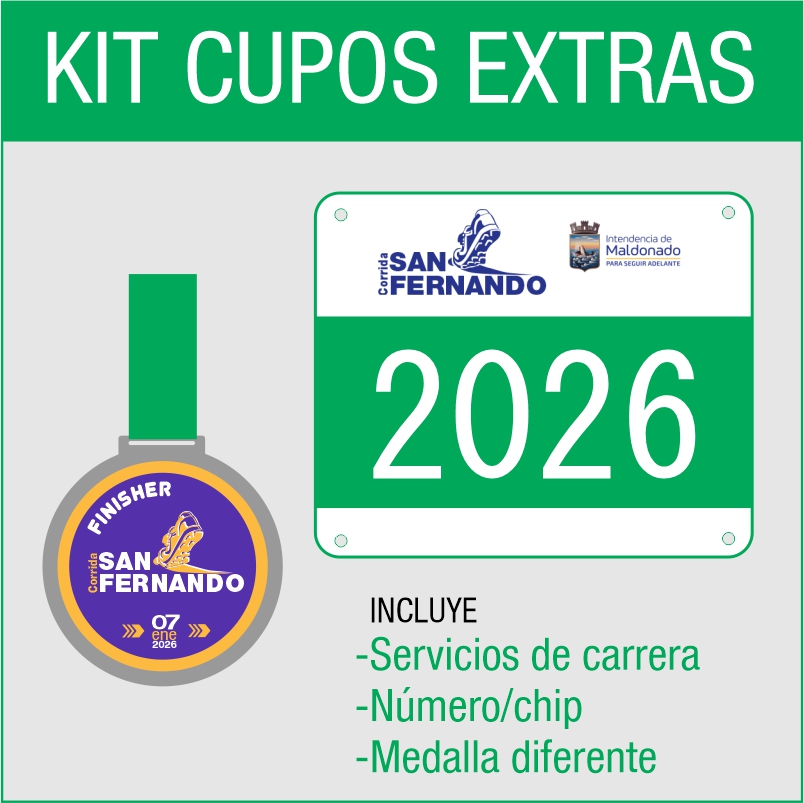 Hemos agregado algunos cupos extras a pedido de varios corredores que no han llegado a tiempo a inscribirse. Para ello, podemos ofrecerles a aquellos que deseen competir, un kit especial que consta de numero/chip de cronometraje, una medalla diferente en la línea de llegada y por supuesto el derecho a participar y hacer uso de todos los servicios generales de la carrera.